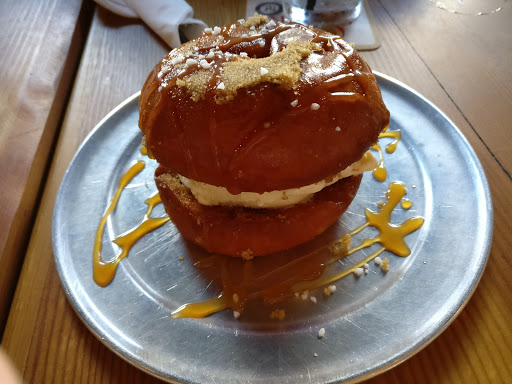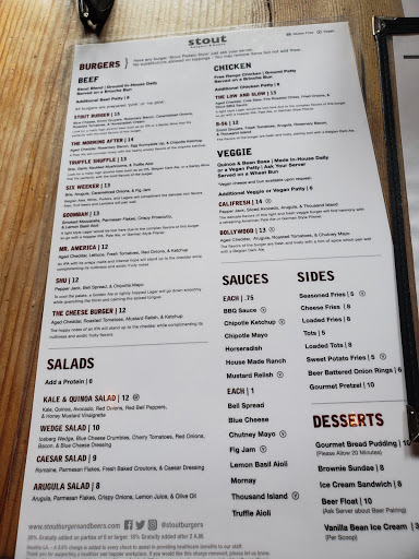 Stout has the most incredible food. The burgers are UNBELIEVABLE. I tried the hangover burger and it was so good, it comes on a warm soft bun with melted cheese, and over easy egg, and super good ketchup like sauce. I never finish my food and I ate the entire thing. Dessert was even better, the bread pudding was incredible. Its cooked perfecting and they make it right when you order it so its still soft and warm. The ice cream sandwich is also crazy good. The ice-cream is sandwiched by a homemade donut and is a good combo of sweet and savory. Theres also tons of variety when it comes to the beer they have on tap and the entire staff knows what beer pairs well with which items of food and are super helpful figuring out whats going to taste best to you. The staff is also very friendly and accommodating. Dana, India, and Josh were helping my table the entire time and always made sure we had everything we needed and got our food and drinks out. Overall a super cool and friendly environment where you can people watch from your table and just hang out. Definitely would recommend going to Stout!!