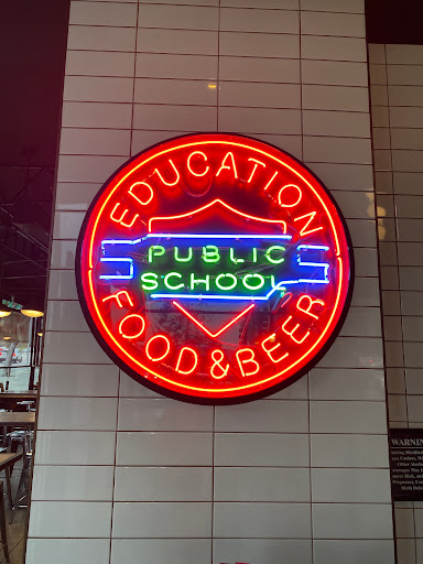 A bunch of yelpers decided to get together and we started out down the street.... we should have stayed there haha. Public School wasnt especially busy, at ALL! We were told for a group of six it would about 35-40 minutes or any table around bar or outside that has stools, was open seating. We decided on the quickest option and got a high top for 6 outside. All the tables on the patio were dirty and had dishes. That was kind of weird, seeing as the place wasnt too busy. If youve been to a busy place that has open seating, youll occasionally get snag a table that has some dishes on it. No big deal. We gathered the dishes and tableware and out it all on the edge of the table closest to the aisle. We were there for about an a hour and a half and it never go picked up, nor did the dishes on the other tables. At some point I had to go to restroom. Be careful!!! The floor is close to the kitchen and they dont put mats down. Its literally like a slip in slide. So I slide my way in to the restroom and surprise surprise it looks like a war zone. Im not going to rate the service or anything else. I try to always give constructive criticism when I give a negative review (and its rare I give one.)... so he is my constructive criticism..... CLEAN IT UP. Dear management, I took pix and posted them. So I dont need your comments trying to downplay what was going on. Take the advice and move forward. I will not be back... Check out my yelp review for pix.