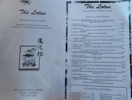 Very friendly staff/owner, intimate setting, quiet and relaxed. GREAT Chinese and Japanese food - I have never been disappointed by a meal from Lotus; the negative reviews were a shock to me! The tempura is crisp and tasty - never oily. The vegetables used are fresh and flavorful. The meats are never that rubbery tasteless stuff you get at other restaurants - its always great. They have a pretty big vegetarian menu as well; Im a meat-lover and still find myself ordering from their veggie menu!! ALSO they have delicious SUSHI - made in artistic ways by their sushi chef. (AND, Ive never been ill after their food, which is more than I can say about similar establishments in Ukiah...) This restaurant deserves a better review than those that came before mine - I hope this helps you choose where to go for dinner - Im ordering Lotus!! :P