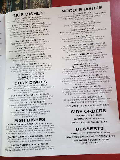 Enjoyable Thai. The Honey Roasted Duck was too small yet it and the veggies were prepared very well. Loved the spring rolls which were very crisp and light. As always, any pineapple rice will be enjoyable, was very happy there were some jumbo shrimp included. Its been a few years since Ive been here, happy to see they continue to cook enjoyable food.