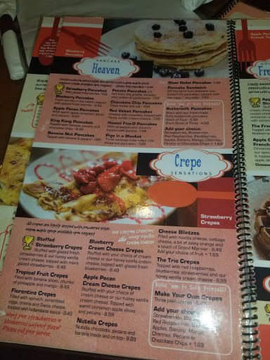 Cozy little breakfast spot with good food, and very friendly service. I had the apple pecan stuffed French toast with honey cream cheese, and it was pretty good. Definitely better than similar fare from IHOP. My wife had the crepes, but she thought they were awful, so she ordered a waffle instead, which was much better.