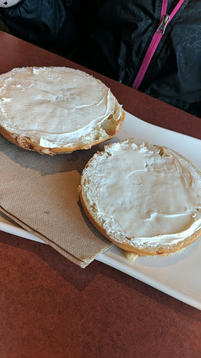 Love CRUNCH BAGELS. VERY LARGE SO I CUT IT IN HALF. They freeze really good. 15.oo for 13 very large bagels. They are awesome. ? Come with two sides of awesome cream cheese. Good food. Good atmosphere. Needs soft music though.