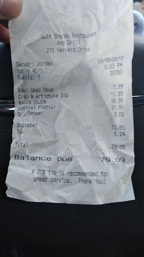 Went for the first time to Gulf Shores. I am sorry to say it was such a disappointment to my friend and I. We ordered the fish poor boy sandwich with cole slaw and fries. When our order was delivered, a battered 3" x 1 1/2" x 1" piece of cod was placed on a 6 or 7" huge chunk of french bread that was cut in half, buttered and grilled, and then the fish and entire bread surface was enveloped and overflowing with chopped lettuce. We could have laughed if we were not so shocked. I asked the waitress why such a huge chunk of bread, and she said that is what they are given--based on her comment, I am guessing this is distributed to them as part of a chain. I removed everything except 1/3 of the bottom piece of french bread which was still too thick and too much bread and placed this small piece of fish on it; then proceeded to eat. The fish did not have much flavor. When we tasted the cole slaw it was not to mine or my friends liking as the dressing was too "soupy". Fries were good, but nothing worth $13. I was hoping the cod fish sandwich would have been good as they never would have lost me as a customer.