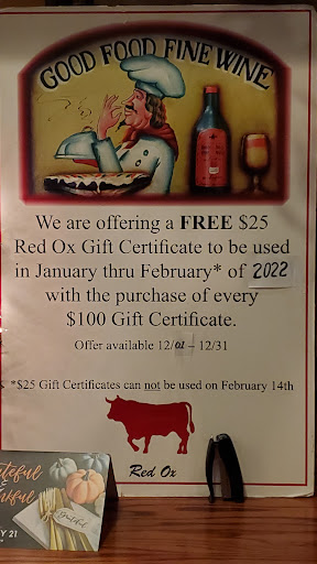 Red Ox is a great place to meet family for dinner. The food is consistent, the pizza yummy. They have nice specials including 1/2 price pizza Thursdays. The chicken and spaghetti dishes are special and my family always goes for them. Im vegetarian so I enjoy the salads and the meat free nachos.