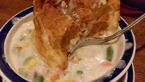 Usually order soup to go and everytime the lady at the front is welcoming, quick and usually doing ten things at once. How she manages everything so well is a testament to her work ethic. Usually packed at dinner time as this is the only sit down restaurant in the area. Rosatis just expanded to an eat in restaurant but these two are basically it for this area. As such, prices are on the higher end. Tonight we ate in and it was a good experience. Chicken pot pie was good but at $13.95 it should be outstanding like at Claim Jumpers in South Barrington! Split pea soup was tasty. Fried chicken wasnt anything special but was better than others. Waitress was attentive and refilled water as often as needed. Homemade bread loaf was great. Definitely give Red Ox a try when in the area. Would be nice if they opened for lunch or offered a salad bar.