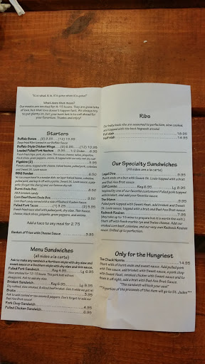 BBQ is authentic! Never dry, always moist and flavorful! We have the Burnt Ends, brisket, pulled pork, slab of ribs, beans, kick your mother in the mouth potato salad, fries, and pork chop. We love all the sandwiches with their combination of meats. There is one sandwich that has it all on it. It is huge but delicious! Big enough to share for sure! You have to give this place a try.