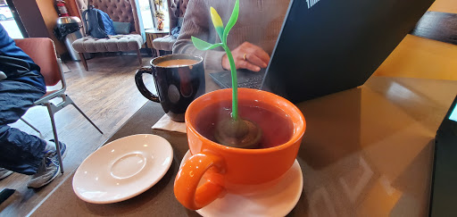 Excellent coffee with very friendly service. Their beans are locally roasted and have a slightly chocolate flavor not bitter at all. Really wonderful! Also a great place to drink your beverage while waiting for the train. They have tasty food and snacks as well.