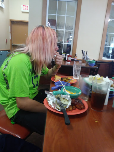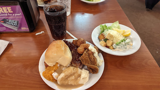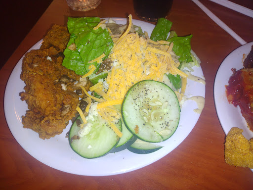 Unfortunately we travel from Atlanta to Rockford about 10 times per year on business and each time we come here because of the salad and veggies. The fried chicken, fried shrimp and fried butterfly shrimp were always too hard and usually taste a bit like old grease. All bad this time as well.. The salad was very good as usual. The place is a tab junkie as always and the ribs were too dry. Today, The front counter hostess was pleasant but the only thing that made it not as unpleasant was the quality customer service we received from our guest services rep. He constantly cleaned his area. We watched him greet the guest in his section. He cleared our table as he saw necessary and we are highly satisfied with his level of customer care. He wore his uniform neatly and his name tag visibly reads Devonte. I am proud to see that this young man takes pride in his uniform because he is wearing an undershirt beneath his white dress shirt. Kudos Devonte...Great Job!!! It appears that the restroom needs to be checked more frequently because each time I come, they always need some form of care.
