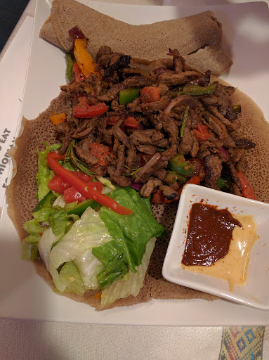 Stop looking for your fork, you eat with Injera (Ethiopian Flatbread). Food is amazing! Good vegan options too. The atmosphere is not the best.