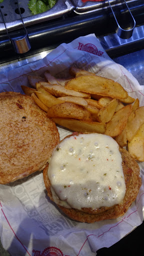 The burgers and fries are delicious. Ive always enjoyed being able to top my burger my way and Fuddruckers is the place to go for that. A bit pricey though. The restaurant is fairly clean however its a little dark and sometimes the cheese dispenser is empty. Usually not a crowded restaurant.
