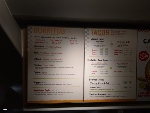 You can get a good burrito at a lot of places for a reasonable price, but most of those places dont offer a seafood option. I go to Baja Fresh when I want grilled fish or shrimp in my tacos/burritos. Plus they give you a basket of chips to go with some orders to which you can use any number of the salas on their salsa bar.