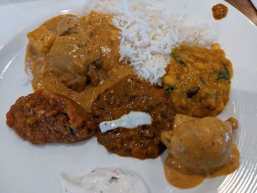 This was recommended to us by everybody who knew it as the best Indian restaurant in the region, so expectations were high. The food was good indeed, with all sauces tasting good to excellent. Minor deductions for slightly dry meat in the Chicken Vindaloo and the Rogan Josh and rather dry and crumbly Naan. The vegetarian Tali featured excellent chick peas, paneer, good black lentils and forgetable potatoes. The Masala tea was OK and the Mango Lassi tasty, the Gulab Jamun lacked flavor. So far, so good, now lets talk about the incompetent service. Always there when you didnt need him, but running off when you did, removing menus before everybody had ordered their drinks - the good man simply lacked a professional waiters sense of timing. He also confused the lamb and chicken dishes, failed to serve dessert without being reminded, managed to pack the wrong leftovers up and was basically more of a nuisance than an enabler of culinary pleasure. The food deserves better.