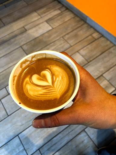 4A Coffee is a nice, barebones cafe. Its small and has no seats or tables. Service is efficient. I enjoyed my skim latte. It had a nice, strong taste. I have no idea what the machinery is behind the counter, but assume obviously its coffee roasting equipment. Either way, it looks cool. I also like that this place originated in Kazakhstan. Cant say Ive had coffee from a Kazakh cafe before!