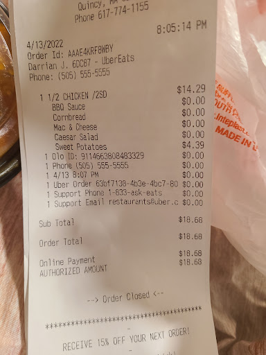 Food is delicious but the service was terrible today - my Granddad bought a whole chicken and 2 large sides but they wouldnt give us corn bread unlesd we bought the 3 side family meal. It was a sad testament to lack of common courtesy today!