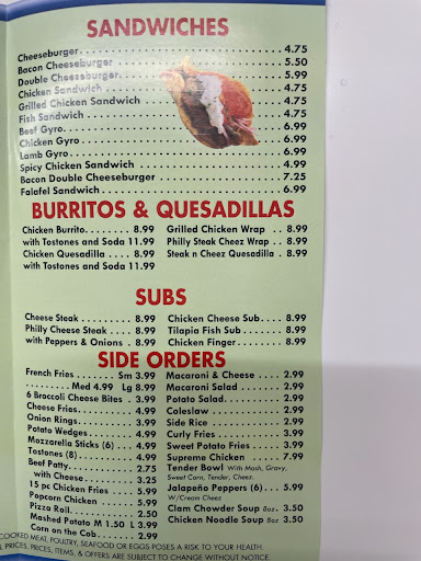 Disgusting. Live down the street, got soggy fries, discolored lettuce, and a burned piece of grill gunk in my burger. I dont know whose cooking but I atleast hope they wash their damn hands. Also took an hour when they live approximately 2/3 minutes away on google maps. Food was cold