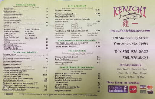 This was a great find on Shrewsbury Street! Me and my Dad were looking for a restaurant that was still open at 11:30, and Kenichi was open until 1, I think. Some of the options seemed a little pricey, but still not outrageous, especially for a restaurant in the city.The menu had many choices, and even had a little note at the bottom of the menu that if you didnt see anything you liked, the chefs could probably make something for you. The decor was both refined and casual. I felt very comfortable in the wooden booth and enjoyed the variety in seating and the option to sit by the window. I ordered the General Chicken which was reasonably priced, and asked for it to be extra spicy, which was almost a mistake, but it was so tasty, I didnt mind the extreme spiciness. The presentation was absolutely beautiful. Dad ordered the pad thai, which I sampled and found to be satisfactory. The waitresses were very kind and friendly, and also made sure we had absolutely everything we needed. The hostess even tolerated my Dads jabbering with a smile. I will have to come back and try more dishes soon!