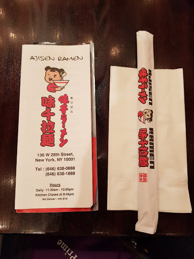 We were visiting NY on a vacation and this place was was right across the street from our hotel. My son is into trying new foods and had never been to a ramen place (neither had we). He begged to go so we stepped out for dinner on a Thursday night. We walked in and were almost immediately greeted with a smile and seated near a window. We were pleasantly surprised at the inside since the outside makes it look so much smaller. It was not terribly busy when we went. Alice was our waitress and she was very friendly and helpful as we had a few questions before ordering. We had the chicken teriyaki ramen, pork buns, gyoza and a pork ramen bowl. No complaints at all about the food. My husband literally has been dreaming about pork buns since he last visited NYC a few years back. Ajisen makes theirs a little different as they use pork belly. He was in love with their recipe! He even ordered more to go to have as a late night snack at the hotel. I love gyoza and theirs was so very tasty! My son tried both and loved them. He almost ate 2 whole orders of the gyoza himself! As for the ramen.....It arrived piping hot to us and the smell of the food was killing us as we stirred it around to cool it down. It was amazing! Our mouths were watering waiting to get a bite into our mouth! Everything about the ramen was delicious! The meat was tender and the broth was flavorful. We added some of the "ramen pepper" which is a blend of black pepper, onion powder and something else. It really did add a pop of extra flavor. We also ordered bubble teas. We tried the passion fruit and the coconut. HOLY BUBBLE TEA! We love bubble tea and order it every chance we get. The passion fruit was good, but the coconut was like a refreshing oasis that we didnt know we needed. We ordered an extra one of these too! Steven came over to bring our teas. Our son was wearing a Dragon Ball shirt and Steven took the time to talk to our son about Gorky and the likes. He actually gave my son time to talk and he listened. It made his night. Kiddo asked for extra chop sticks because, well, hes 9 and chopsticks are cool. We were given plenty extra with a smile. Between the food, bubble teas, Alice and Steven, this was pretty much our favorite dining experience during our 6 days in New York. We plan to go back and may stay in a different area, but Ajisen in Chelsea is already on our go back to list!