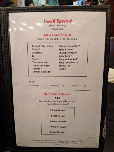 This place is alright. I had the veggie ramen, my wife had a philidelphia roll and an avocado roll. Her avocado role was good, my ramen was bland. My wife thought the sushi they used for her philly roll had food coloring, which didnt make her happy. The service was prompt. They were playing loud, annoying pop music.