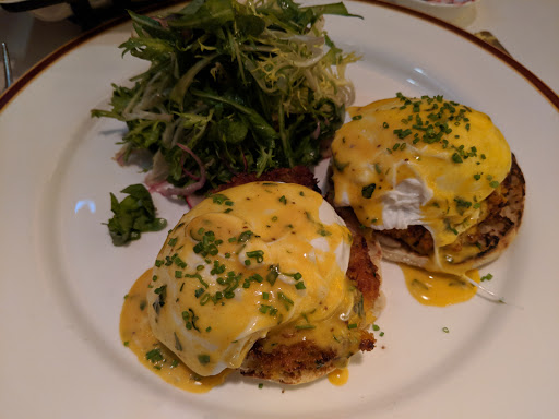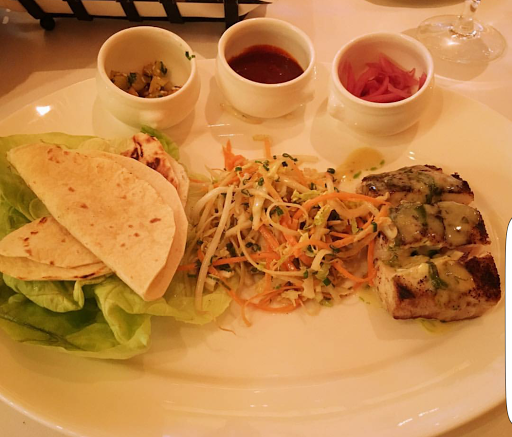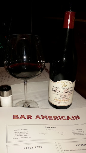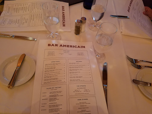 I LOVED Bar Americain. We had a private event here and I was just blown away by the food. Passed appetizers included beef tartare, mushroom puffs, and chicken skewers, among others. The meal included three courses-- (1) Spicy tuna tartare or pear salad. I got the tuna, and it was GREAT though Im not a fan of capers and it was loaded with capers... still, the tuna shone through and the plating was beautiful and practical. (2) Chicken pot pie or mahi mahi tacos. I got the tacos and loved putting them together with lots of sides--avocado, spicy sauce, some sort of pepper dish, etc. I heard the pot pie was also awesome, with a sweet potato crust. (3) The dessert was a coconut chiffon cake that was light and lovely. And we had bread on the table that was quite tasty, including these little cornbread fingers that were like candy. Overall, it was just such a beautiful event with excellent food. The service was excellent too--timely, courteous, and with a great sense of humor.