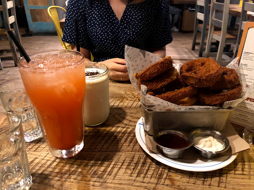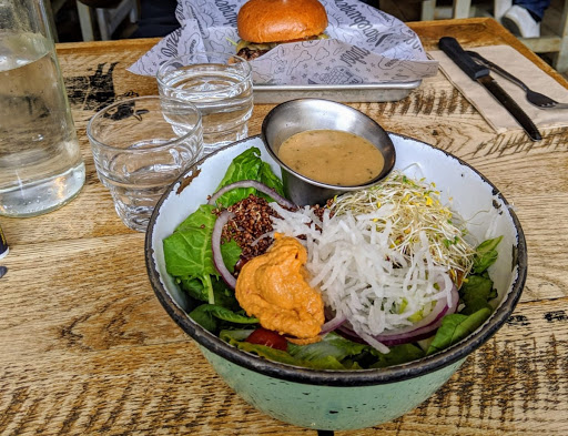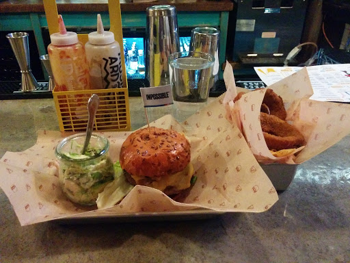Solid food and nice drink selection. I had the Impossible Burger with fries. The burger was great (tasted like a regular burger) though next time Ill customize it. The standard offering had too many pickles for my taste and I think that also caused some issues with the patty coming apart a bit on the edges. I got the smores dessert because its hard to pass on smores, but it was mostly ice cream and too big for one person, so next time Ill pass. The service was really friendly. I thought it was slow (waiting for my server to return) until I realized its one of those places where you just flag anyone down as needed. Ill be back.