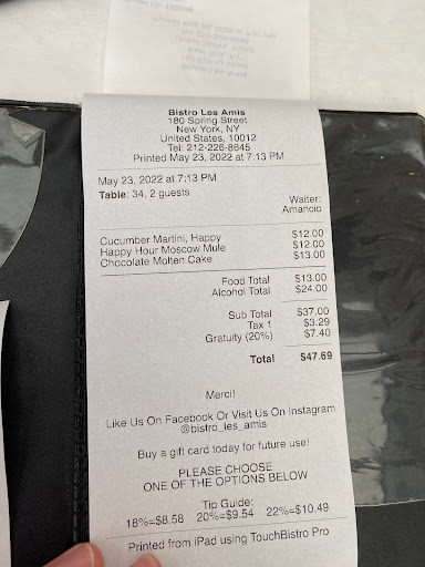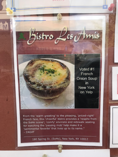 My husband and I were on a rare trip to NYC. We decided to stroll through the city and find a place that felt right. After being ignored or treated rudely at so many other restaurants, we found Bistro Les Amis. The food was awesome, the staff attentive and the ambiance was perfect. We look forward to coming back again!!