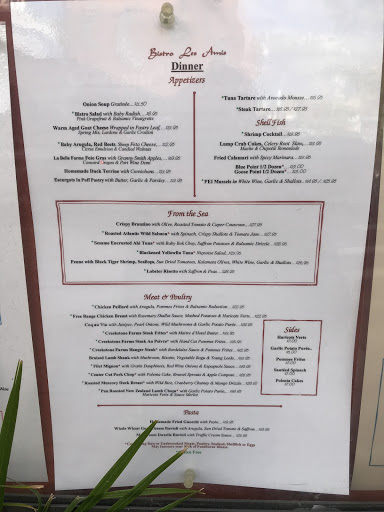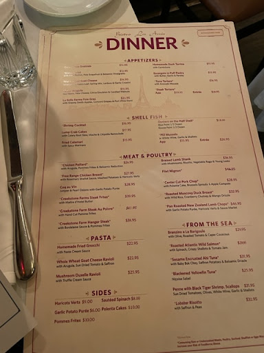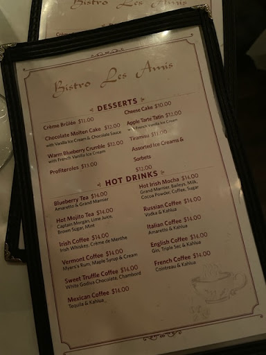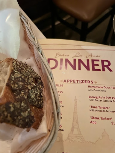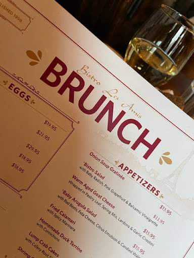 We showed up to Bistro les Amis for a late dinner on a Friday night without a reservation, and were immediately entranced by the cozy bistros romantic decor. The entire staff is friendly, courteous and attentive without being overly intrusive. The fried calamari, the crab cake and the shrimp cocktail were great appetizers and the white wine pairing was perfect with prices reasonable enough for a french bistro in the heart of SoHo. Great place, romantic ambiance, perfect background music, attentive and friendly staff- overall a great place to go for a cozy, comfortable and romantic atmosphere!