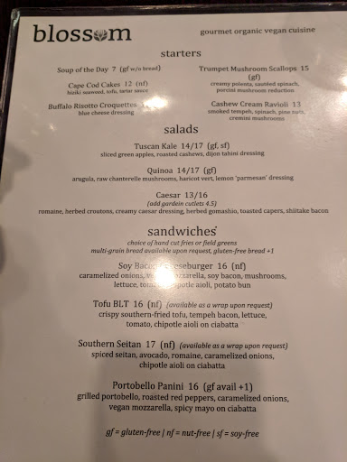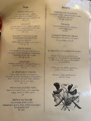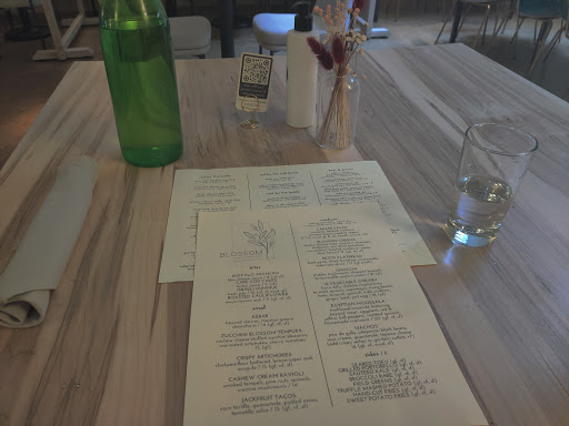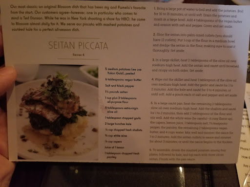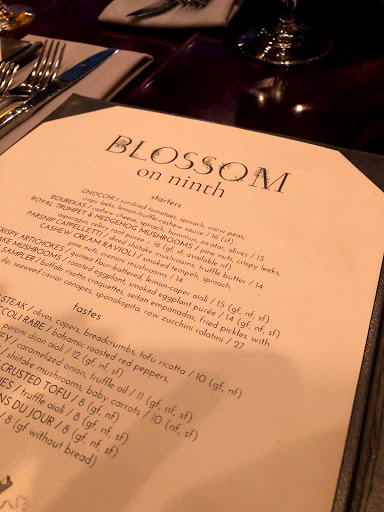 So an avowed meatarian, a new vegetarian who still remembers good meat dishes (me), and two diehard vegetarians who know their food walk into this place, and I admit we were a skeptical bunch. We knew Blossom was a little on the pricey side so our expectations were even higher. But as you walk in, the intimate ambiance and the instant seating already added points to our report cards. We dove right in and ordered; we shared the hickory smoked tempeh (a delicious treat and with the potato fries it was unbelievable), the risotto ( a bit on the bland side but the fried tofu more than made up for it), the seitan dish (I cant believe it wasnt meat; they nailed the texture but none of the grease and fat, absolutely delicious), and had the pasta to boot (the sauce was unbelievable). Ive only been to one or two other vegan places (GOBO) but I already know this is one of my favorites. Add to that a great ambiance and close proximity to UCB theater and I know this will be one of the go-to places for me. And need I mention the delicious dessert? I decided to be adventurous and pair the four level parfait with a glass of wine and was really pleased. My girlfriend didnt like the cheesecake so much but the apple cobbler was really on par. Overall, delicious place to go!