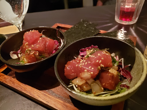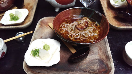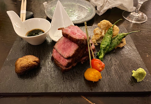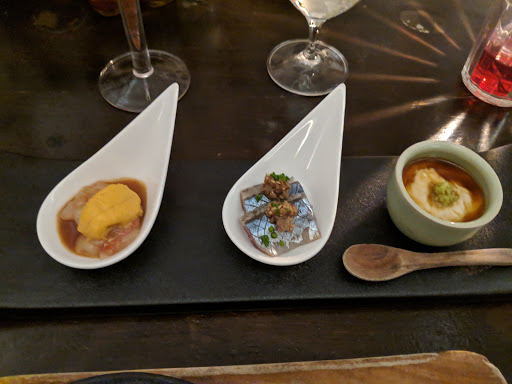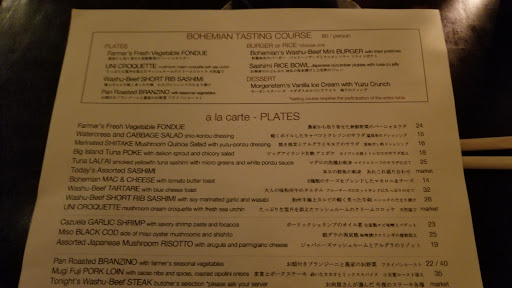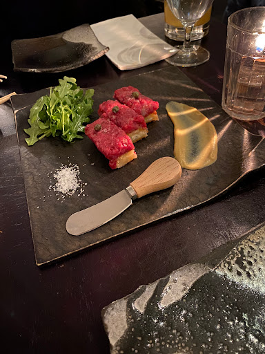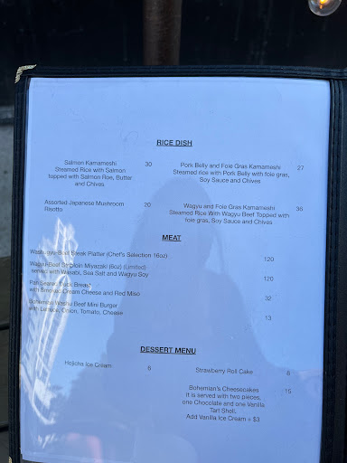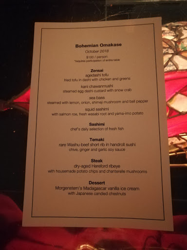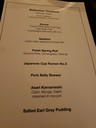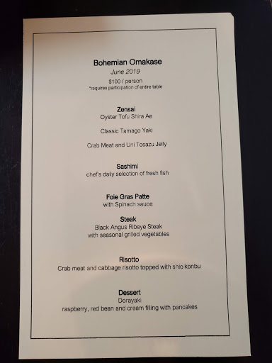 Review number 700 had to be saved for an amazingly awesome restaurant, and Bohemian fits the bill perfectly. I can not say this enough but man this place is amazing. Bohemian is literally a hidden gem in the city. And when I say literally, it is literally behind the Japanese butcher shop, and their phone number isnt listed for anyone to come here and eat. In order to even make a reservation here, you have to know someone who has eaten here before to get the number. Call to make a reservation, and theyll actually ask who gave you the number. Pretty wild for a restaurant, but I guess its to keep the crowd down. Inside, there really isnt much seating. At the bar, you can probably fit 5-8 people, and with the couple of tables that they have, you can add in another 20ish people. That means that on a busy day, there could be less people here than at your local McDonalds. The decor is amazing. Nice and dim, this is a spot to go out on a date. There is a nice little zen garden here, which is actually pretty cool to look at. So with any restaurant, you are coming here for the food. At Bohemian, they do not disappoint. What is amazing? Well the list keeps on going and going: - Foie Gras Soba - Uni Croquette - Wagyu Beef Burgers - Beef Sashimi - Ikura Caviar Rice Bowl - Sake Panna Cotta By far, my favorite dish here was the beef sashimi. Amazing amazing amazing. If you dont get anything else here, get the beef sashimi. Thats not to say that the other things here arent amazing either. If I could, I would come here every night for dinner because its just that good. The drinks here arent half bad either. Before dinner, I had myself a Manhattan and it was made just as well as the one Id get at Angels Share or PDT. On top of that, the service here is pretty damn good too. With only about 10 people here at a time, they are on the ball. Bohemian is not a place to be missed. The food is well worth the money, and in actuality, the price isnt half bad either. Drinks are solid, service is prompt, and the ambiance is amazing. I cant think of a bad thing to say about Bohemian except for the fact that I should have eaten here sooner!
