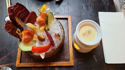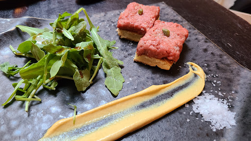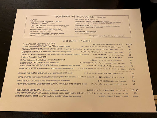Bohemian restaurant is an intimate Japanese speakeasy that serves amazing gut-busting dishes (esp if you get their prix fixe for $58 pp). Three dishes they deliver exceptionally well: beef sashimi, roasted branzino, and Honey Lemon pannacotta. *Unfortunately, I will only share the number with people I know. Intimate- The restaurant can seat ~30 people maximum at one time. So very small space. And they only accept reservations for a Max of 6 people at one time. Due to the space limitation, they have Very strict policies. The FOOD was surprising and delicious. -The Farmers Fresh Vegetable Fondue was beautiful display of fresh daikon, white and orange baby carrots, cherry tomatoes, cucumbers, red peppers, and radicchio. Beautiful, appetizing and fun to dip into the fondue. Fondue was warmed with a tea light candle. -Uni croquette was a mushroom croquette topped with uni. Great crispy mushroom croquette, I just wished the uni tasted more briny. Not my favorite but my friends enjoyed this dish very much. -The Washu short-rib Beef sashimi was so fatty, it had the consistency of oh-toro. I loved it! They gave condiments of wasabi, lemon, mushroom infused garlic and daikon. The best pairing was with mushroom infused garlic. The mushroom and garlic with the fatty beef melds into the perfect bite. -Pan roasted Branzini. I was surprised how delicious roasted fish can be. Easily one of the better dishes in the prix fixe menu. Roasted with olive oil, garlic, olives, baby potatoes, cauliflower, rosemary, anchovies, and zucchini. So good. I am definitely coming back to order this. -Kobe and angus beef sliders. Perfect medium rare. And they cooked 6 of them to the perfect T and doneness. Juicy, perfectly seasoned. Very good. What I loved more than the slider was the roasted potatoes accompanying this dish. Salty, crunchy, carmelized potatoes. OMG. too good. - Honey lemon yuzu panna cotta. Loved the Lemon and yuzu in the pannacotta. Very appetizing. The panna cotta was smooth and creamy. I would have asked for two if I wasnt so full.