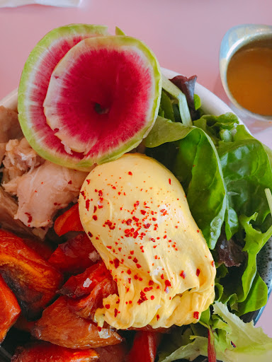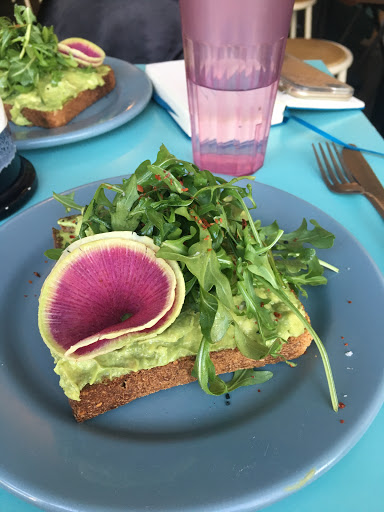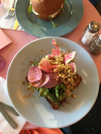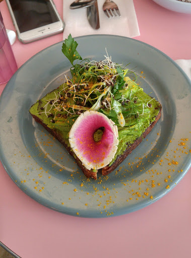 Fresh veggies and beautiful presentations... Come get your avo toast with a bright yellow turmeric egg and shaved watermelon radish and feel pretty inside and out