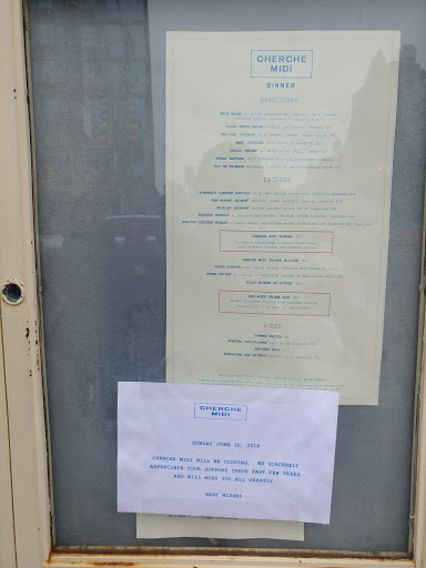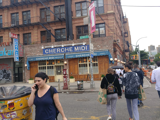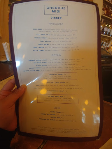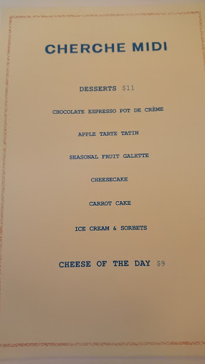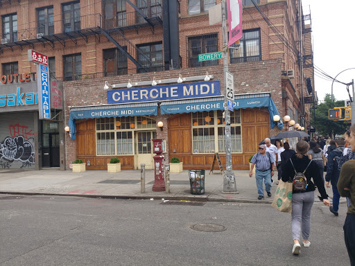When Dale said we were going to a French Bistro on the corner of Bowery and Houston Street, I rolled my eyes…… Dale doesnt generally like French Bistros and I dont like to fight traffic with a half hour $18 taxi ride for that kind of dinner……..but, ok, our dinner guest lives in the neighborhood and the restaurant got a good review in the NY Times (generally another reason not to go). Cherche Midi was a pleasant surprise.........a large, square room designed to look the way it should (light of hand)...........a pleasant greeting from the folks in charge..........a nice table spaced so theres action but not close enough to make new friends………and you can hear each other talking even though the restaurant is designed with hard surfaces. Across the street from Whole Foods, the clientele looks it...........thats a good thing. Staff if plentiful, young, attractive and on the ball. Appetizers were terrific. Entrees workmanlike. If we lived in the area, wed come all the time..........its that kind of restaurant. As we dont, its on the list when having dinner with people who do.