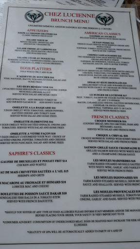My mother,brother and I went to Harlem yesterday to see my sisters new place,we ate at Chez Lucienne for brunch. We had a wonderful time. We were seated immediately upon arrival. Our server was Maya, who was absolutely charming and very attentive. We got our drink orders in good time. We ordered fried calamari it was excellent. My brother had the escargo (snails). He loved them. Our main courses were hot and delicious. I had the Ceasar salad with grilled chicken it was perfect, my brother had the coq au vin he loved it, Mom had the crepe with salmon and spinach and sister had crepe with cheese and mushrooms, they all loved their dishes with sauces. We will eat here again when we take another trip in to the city. Mom and brother live on Long Island and I live in Queens.