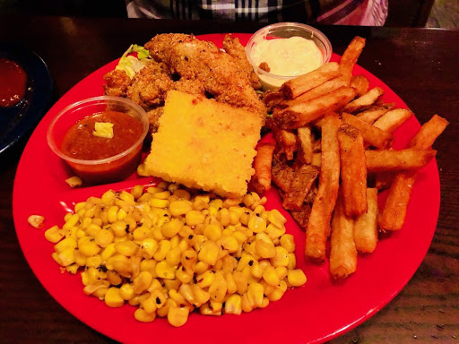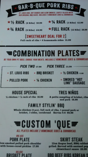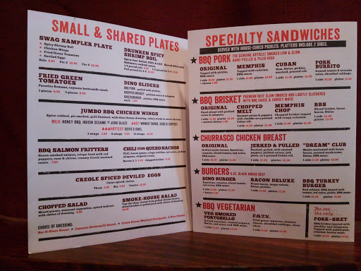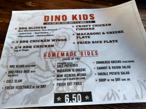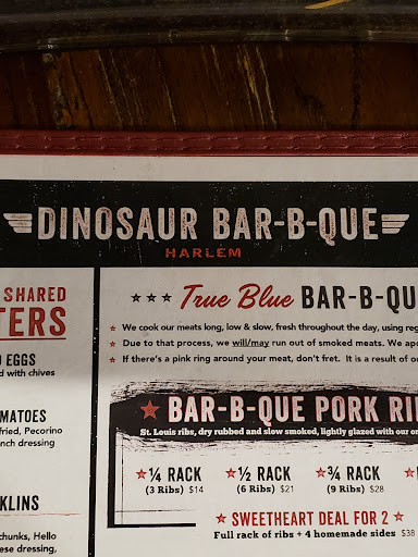 I came here for a 4th of July celebration with my girlfriend. Luckily, we booked reservations through OpenTable or else we would have had to wait about 1-2 hours for a table. I love ribs and wings, so this was definitely a must-try. When we arrived, we were immediately offered a table during the busy July 4th day. Our server, Matt, was very friendly and answered the questions we had about the menu thoroughly. We decided to get the Sweetheart Deal for Two as well as the Swag Sampler Plate. For our sides, we got Mac & Cheese, Sweet Potato, BBQ Fried Rice, and Simmered Greens. This was definitely a lot of food and was more than we could handle. The Full Rack of Rib was definitely bigger than we thought, and it was very good. However, I thought the ribs from Dallas BBQ tasted better, aka they were more flavorful. I really LOVED the sweet potato. It is very creamy and full of flavor. The Sweetheart Deal for 2 is definitely very filling and we didnt even need the Swag Sampler Plate. The sampler plate was nothing special and just consisted of eggs, shrimps, wings, and green tomatoes. Even though the restaurant was very busy due to it being July 4th, our server, Matt, would check up on us often to make sure we were doing ok, which I thought was very nice of him. Overall, the food at Dino is definitely a great value, since you get HUGE portions for your money, and the service is great. However, the food itself is only just good, but not amazing. If you want good BBQ food at a great price, this is definitely the place to go.