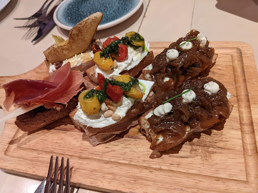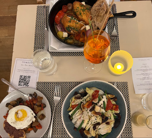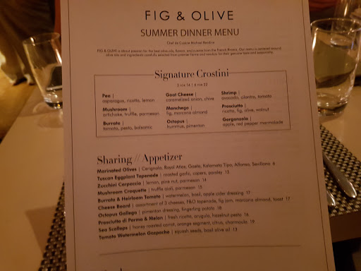 I just salivate when I think of Fig & Olive and the amazing dishes I had there a few evenings ago. This one is located in the meatpacking district, so youd think it would be noisy and overbearing but absolutely not. We were seated at a corner quiet spot, tables were spread far enough. Ordered a bunch of appetizers, a couple of entrees, desserts and delicious wine. From beginning to end, every single dish was absolutely phenomenal. As someone who leaves over half her dishes, I scraped those plates. Definitely get the Crositini apps if you go. They have a large variety and each one has a world of flavors in itself. Decor is really nice and modern, tables get cleaned right away. And service is top notch. The waitstaff is attentive and knowledgeable about the dishes they serve. Ill be back.