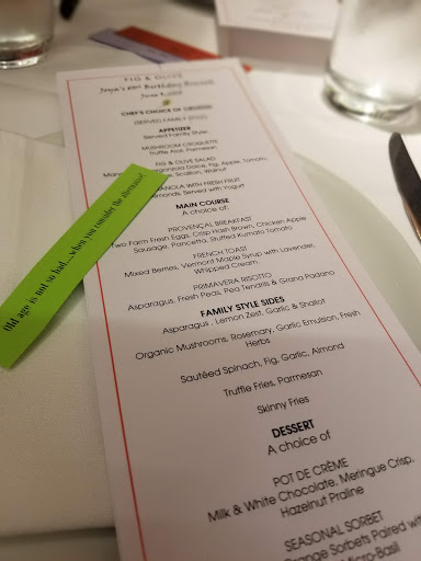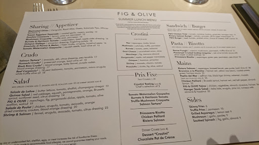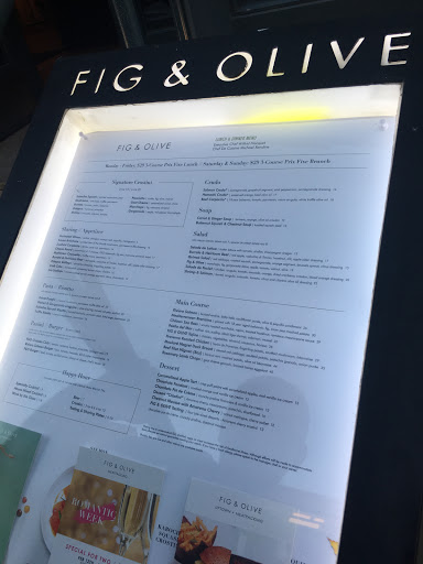 Fig & Olive is a special occasion restaurant through and through. From the decor to the staff to even the pricing, its not a restaurant you visit on a daily basis just for kicks, unless you are rich. That being said, its worth it when you do visit because the food is pretty good, the staff are really friendly and decor and ambiance is pretty amazing. The waiter was always on hand when you needed him, was always attentive, filled our water before it got too low and was gracious enough to explain the menu, as well as add a candle to the dessert for the birthday celebration. I ordered the steak medium well and it came back a bit charred, which was disappointing, but the half chicken was pretty great, as was the scallops we had as an appetizer. If youre celebrating a milestone, there are other places to go to throughout the city, but Fig & Olive is not a bad option either.