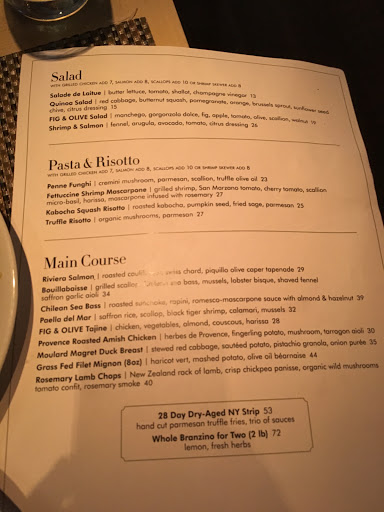 - Thank you Fig and Olive West 13th street! We made a 9p.m reservation for 4 people on Saturday April 16th. When we finally showed up at 9.30pm and with an extra person I was worried that we would not be able to be seated. The front of house staff could not have been any more accommodating to our tardiness and extra person! The place was so busy - and yet within 10 minutes of our arrival we were sitting at a very comfortable table. Our server (Tony) was very friendly and knowledgable about the food and gave us great recommendation on appetizers for the table. The Truffle mushroom croquettes and the Crostini were unbelievable! Everyone loved their main courses. I personally had the Sea Bass - and wasnt for sharing it with anyone!! The entire experience was terrific! Thanks again for the great food and such efficient service!