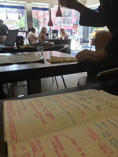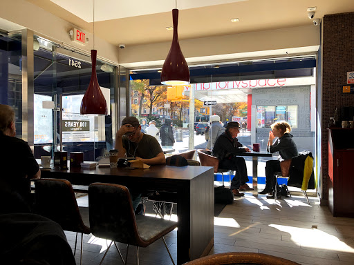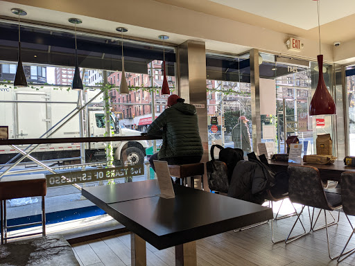 Great cushy seats, large/bright windows, delicious coffee, has both LinkNYC WiFi and its in wifi. Music is kind of loud and disruptive rock, so bring headphones/earbuds.