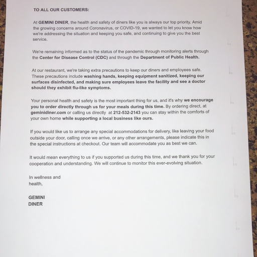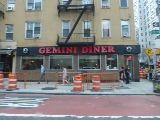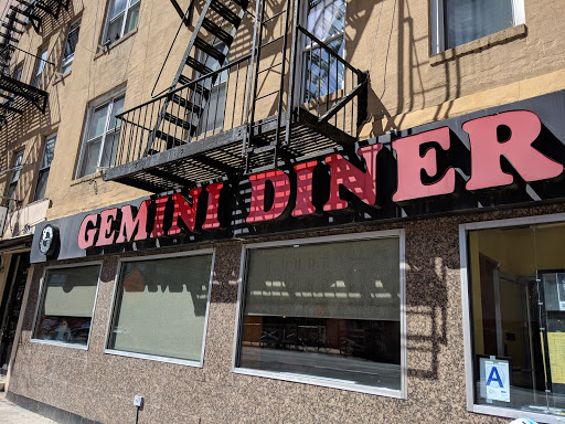 Well-stocked 24/hour NYC diner. Theyve got pretty much anything you could ask for and will make it any time day or night. Gemini is a great stop for dinner, breakfast, or that 5am Im-not-sure-what-to-call-this-meal. The breakfast sandwiches are delicious, the Fries are made fresh for your order, and come out perfect. Banana Walnut pancakes (mmm) or the breakfast/brunch specials are always a good choice too. Great selection of burgers/toppings, but if youre ordering late at night, make sure to ask for them well-done. Very reasonably priced too.