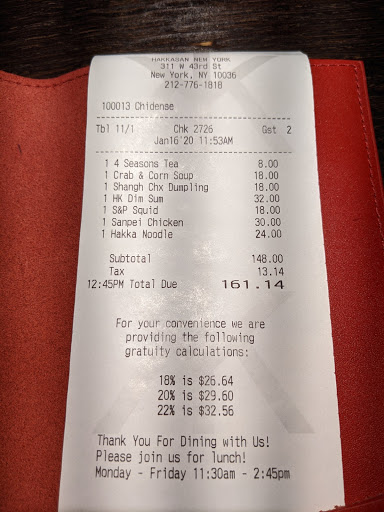 Pretentious and unfriendly staff, overpriced menu, inattentive service, mediocre fake Chinese food >> absolutely to avoid. When made a reservation online on OpenTable, nowhere it says it is “business casual”, even in the confirmation. I went with my spouse for the birthday celebration, a scary looking bouncer at the door refused to let us in. Fine, we live nearby, and asked to push back our reservation a bit so we could go home and change. The bouncer escorted us in, the hostess coldly changed our reservation, and we were escorted back out promptly. Really? Did we commit a crime that deserved public shaming?! Had it not been my spouse’s birthday celebration, we would have walked out at that moment and never come back. Half hour later, we came back, finally got seated. Waiter was nowhere to be found. No menu , no water, no services whatsoever until we could flag someone down. We ordered one appetizer, three entrees, one noodle, and one dessert. The only decent dish was the roasted silver cod. Others were greasy, overcooked dishes overpowered by spices. The Jasmine Tea Smoked Chicken has little taste other than the skin (well, the meat actually tasted like dry cloth)—a dish supposedly modeled after Soy Sauce Chicken which is known for its tenderness and flavor in its meat. The Hakka Noodle with Mushrooms and Chinese Chive was the worst—supposedly Hakkasan’s signature dish?! It is possibly worse than Panda Express quality—so gross that we didn’t even want to finish it. All in all, an extremely unpleasant dining experience. With many other “fusion” options in New York with better services and better food, please look the other way.