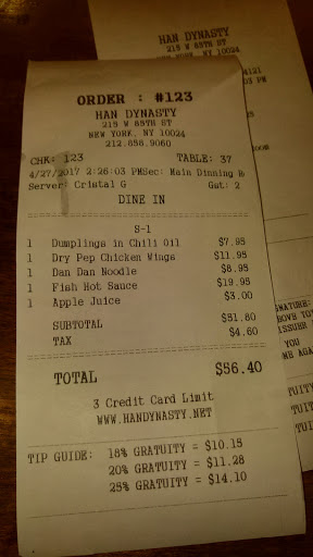 Good food, terrible service........We were very excited when Han dynasty opened on the upper west side, finally bringing good and reasonably priced Chinese food to the area. We have dined at the restaurant a couple of times and ordered take out from there several times. Recently, the delivery service has deteriorated significantly. On at least the last 5 occasions we ordered from there, they have failed to fulfill a simple request - add a side of hot chili oil. As such, every time our order was delivered we would either have to forego an important component of our meal or call the restaurant and wait an additional 15 minutes for the issue to be rectified. Things came to a head last night when we included several requests and reminders within our order for said chili oil and it was again forgotten. I called the restaurant and spoke to a manager who apologized profusely and 15 minutes later we got several sides of chili oil. We then settled down to eat only to discover that the 2 sides of brown rice which we paid for were not included in our order. We do not eat white rice and we had to cook our own brown rice in order to complement the other dishes. I was livid at this time and my wife called back to the restaurant and spoke to the manager again who proceeded to offer a paltry refund of $2.18 for the brown rice that was missing. No further courtesies, 10% off your next order or something. Not even an offer to send over the brown rice! Customer service does not get much worse. Needless to say, we will not be ordering from there ever again. Time to head back to Shun Lee.