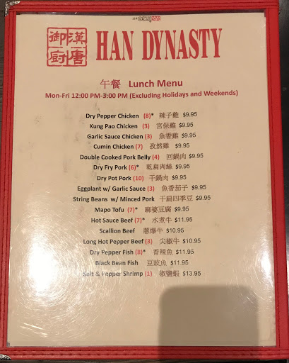 Based on reviews we decided to try Han Dynasty since we were in the area on Labor Day. Unfortunately the food and service fell flat. We waited about 35 minutes before our entrees came out. The 2 tables next to us sat, ate and paid and left before we got our food. The servers were nice and they kept telling us our food was on the way but it still took waaaay too long. The general manager came out and apologized and comped. some items from the bill. The food was ok. Chicken in garlic sauce (good) chicken in scallion sauce (ok) Dan Dan Noodles (spicy and flavorful) Fried Dumplings (not fully fried, not recommended) Unfortunately Im not able to recommend this place.