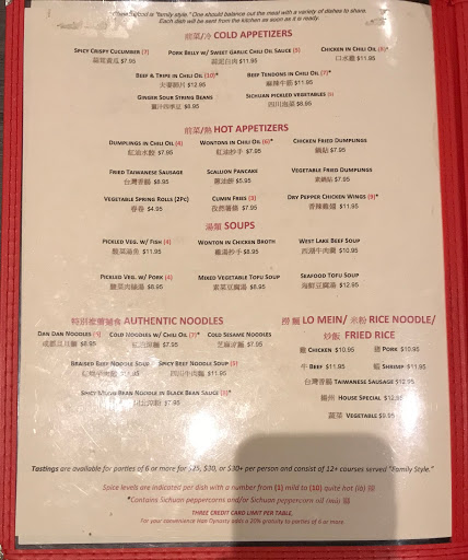 The atmosphere feels like a great dining place, waiters were kind and helpful. And thats pretty much all I can say thats good. First, not sure if the reception desk - but high school or college students were clearly rude. With their casual remarks about Chinese people, its ridiculous because they work in a Chinese-themed restaurant. They even failed to get my name so I could be placed onto the wait list. Second, unnecessary waiting times. We (only 2) saw multiple tables being empty & cleaned/organized and were told that it would take 30 minute wait. Several people who came in after us - immediately got their tables (I even ask another couple if they reserved a table or waited before us, the man told me they just dropped by). The Chinese food is awful like an expensive Panda Express. Disappointed by the proclaimed "Sichuan-style" label. At best, just an Americanized Chinese fast food joint.
