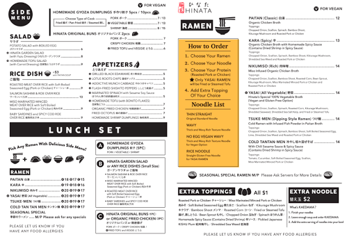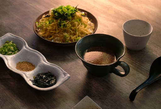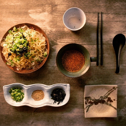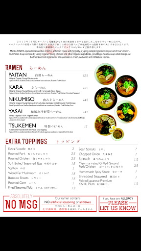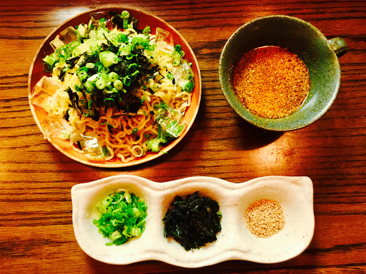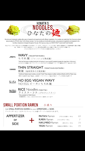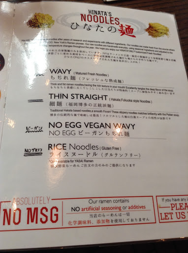 Flavorless ramen for vegetarians- which is sad as its not hard to make good flavor in a simple broth. This is just salt water... When I asked for simple condiments like garlic, spice, vinegar, soy sauce, etc- they have none. Weird. Go to TABATA
