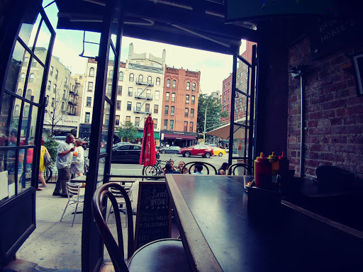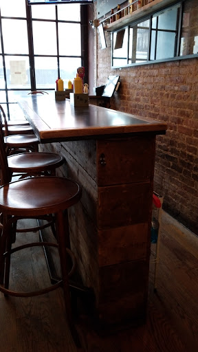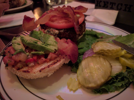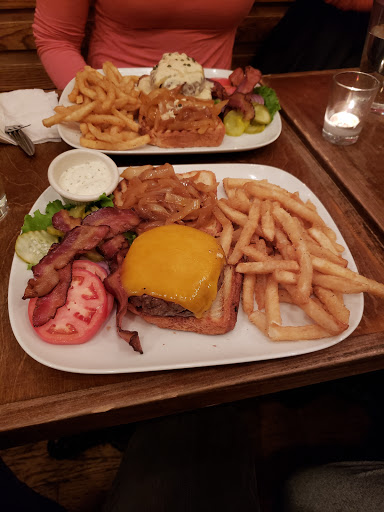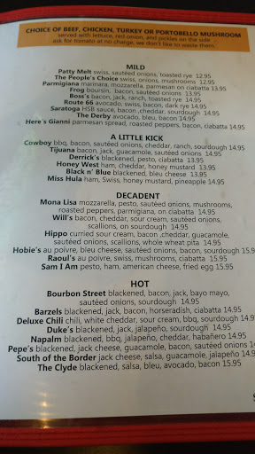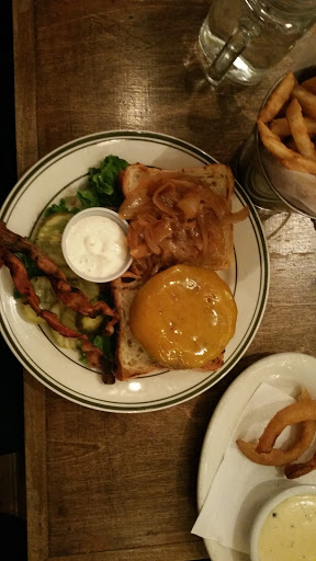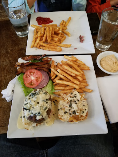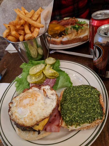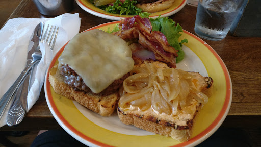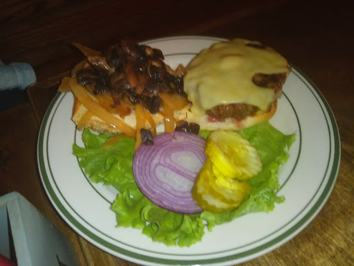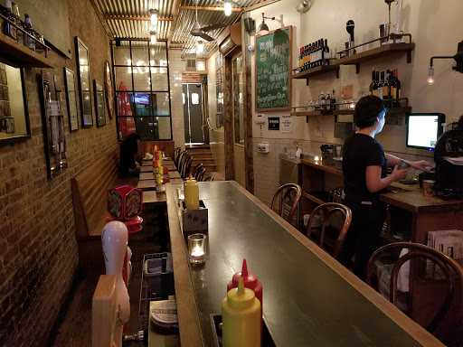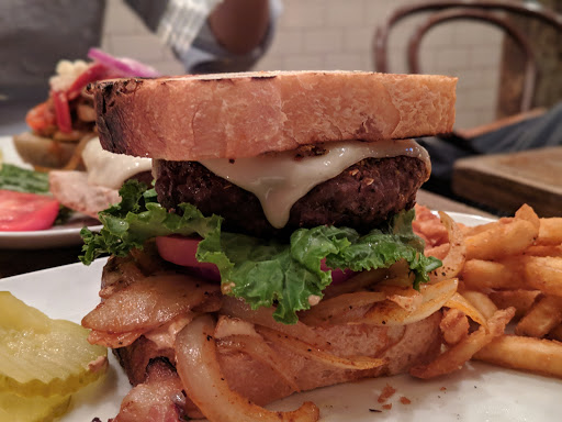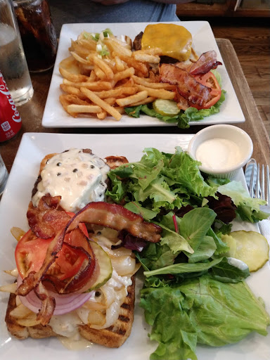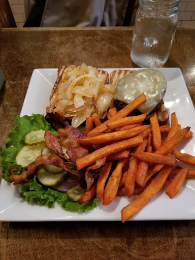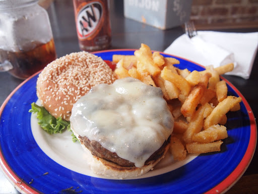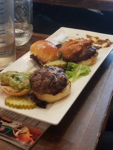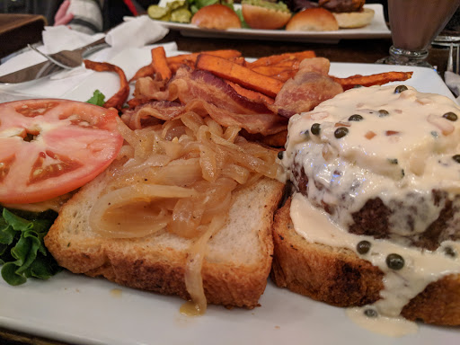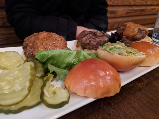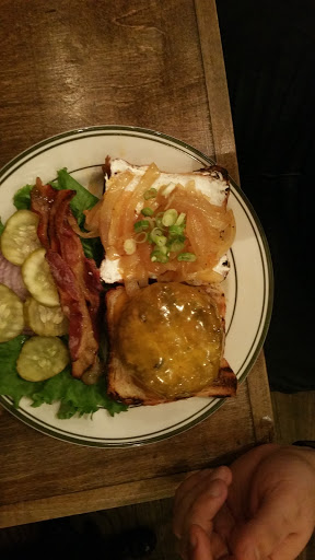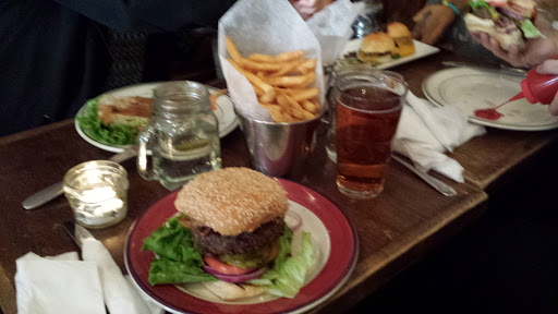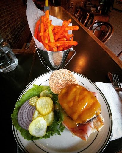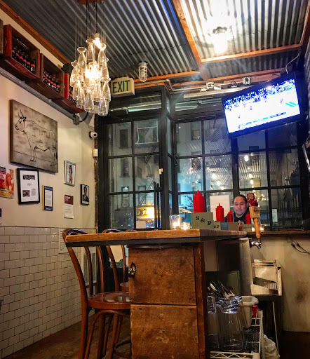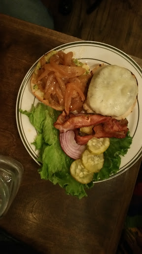 Excellent and highly varied selection of hamburgers at this rustic setting. Edith Pilaf-inspired music played while the U.S. Open was on while I was here, and the happy hour $5 draft beers were a pretty good deal. The hamburgers came cooked as ordered (medium), but the size of the patty and perhaps because it sat on the bun instead of a plate or something to drain properly, caused the bun itself to disintegrate around half way through. So I finished it with knife and fork, which wasnt a bad way to eat it, I suppose. Would come here again.