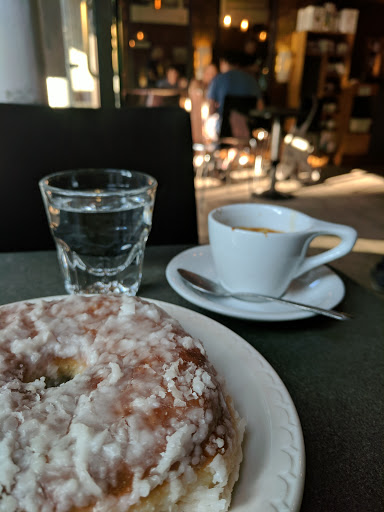 Great espresso (served with sparkling water - yeah!), Indulgent pastries (the coconut cream donut is fab - and apparently has fewer calories than an almond croissant), very friendly service and sun-missed benches (at 8am anyway) outside.