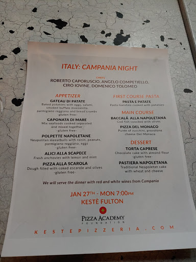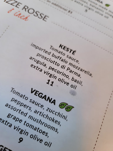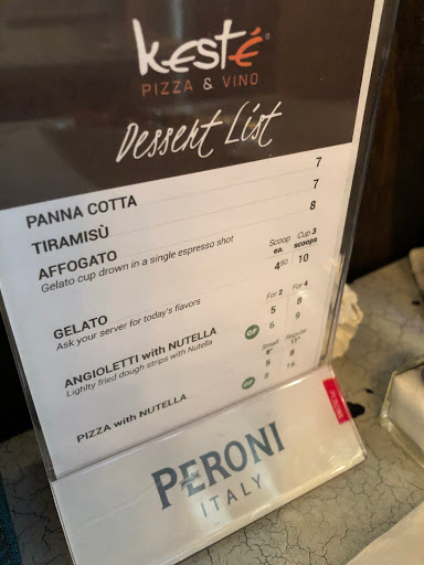I went to Kestè on July 7th with my mom. She was visiting NYC for the first time and I really wanted to show her real Italian pizza. We arrived around 7pm and were seated immediately. We ordered burrata as a starter and each ordered a pizza and glass of wine. The burrata never came, but the pizze arrived quickly so I asked to cancel the burrata since we were happy to begin stuffing our faces with pizza. The waiter was very apologetic as he had missed the burrata and gave us each another glass of wine on the house. Very kind. At a later point, the staff needed to shuffle tables to accommodate a larger party that had arrived. They asked if we could move down one spot, then brought us a large piece of tiramisu for the inconvenience. Despite the few minor inconveniences, I felt this was some of the best service Ive had in NY since I moved here 6 months ago. In terms of the food, I ordered the Pistacchio & Salsiccia pizza and it was delicious. The sausage had a nice flavor, and I especially enjoyed it with the chili oil I drizzled on top :) The tiramisu is worth mentioning as well. Close to being the best tiramisu Ive tasted outside of Italy. Thank you to the staff for making this a really enjoyable evening with my mom. Grazie mille.