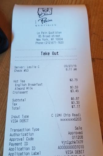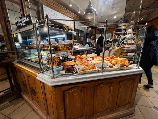 Very good tarts and baguettes but the pain au chocolat and croissants are limp and disappointing. Coffee is mediocre.