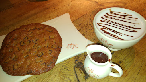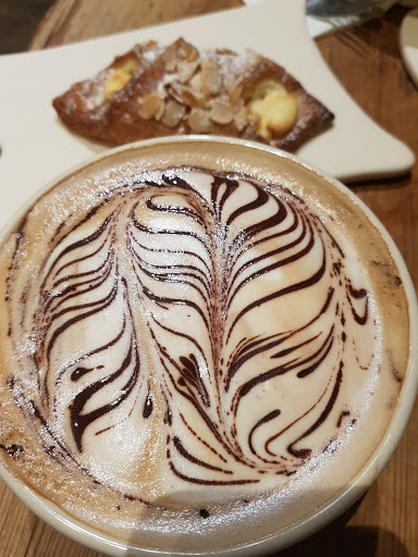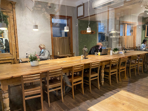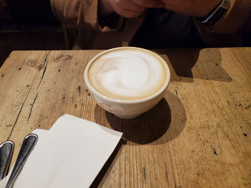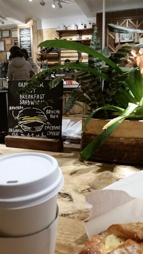 Great place to meet and have a meeting. Outshines the starbucks across the street; the lattes come in great big mugs where you can feel like you got your moneys worth and have a cozy experience. The tables are quaint and the setup of the place is interesting and fun. Cozy up to some strangers and share a meal with a few of them at the great large communal tables to share your daily bread.