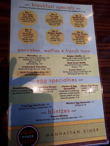 Though I live only a few blocks away, I typically favored Metro or City over Manhattan Diner. However while my parents were staying around the corner during a recent visit, I found myself here every day for 4 days. Great, friendly, fast service and perfectly brewed diner coffee. Also if you are in the mood for dessert, try their 7-layer chocolate cake. Even at the end of the day it was still as fresh as any fancy bakery for half the price!