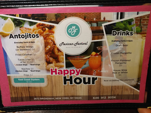 I came here because they advertised mojitos, margaritas, sangria, gin but when we (3 friends) arrived here they were only able to serve margaritas and sangria because "the drinks (mojitos) took too long to prepare and make". Besides that, 2 weeks before I had the pleasure of trying out some delicious churros so I decided to try them again and so I ordered them. To my surprise, they were not the same churros. When I Inquired they explained, they no longer carried them. And while the manager insisted on turning away customer at happy hour time because there is no space by bar.. Thats crazy! They have good chicken wings though. I do have to say though after pointing out the false advertisement of Happy Hour, our bartender "Carlos" obliged and gave us our one mojito for the night and even offers us a a "new drink"they were trying out which we turned away because we couldnt figure out what they were going for. With that said, I dont think I will return to this restaurant. I miss my Mama Mexico! (The restaurant who was here before Mexican Festival existed).